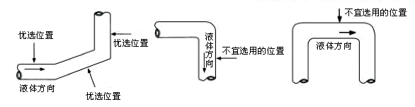 ③首選液體向上(或斜向上)流動的豎直管路,其次是水平管路,盡量避開液體向下(或斜向下)流動的管路,防止液體不滿管。測量點不要選在管路走向的最高點,防止管路內因有氣泡聚集而造成測量不正常。