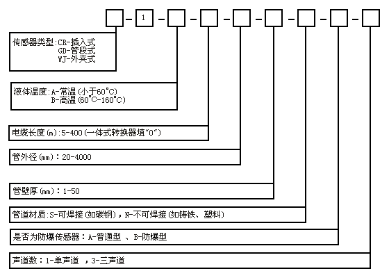 例如:選型外夾式單聲道傳感器,液體常溫,電纜長度15m,管外徑325mm,壁厚10mm,管道材 質為鋼,非防爆。選型編碼為:WJ-1-A-15-325-10-S-A-1