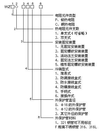 分度號Pt100:A級 R0=100±0.06Ω B級 R0=100±0.12Ω R0/R100=1.3850 分度號Cu50:R0=50±0.05Ω R0/R100=1.428±0.02 ● 型號表示