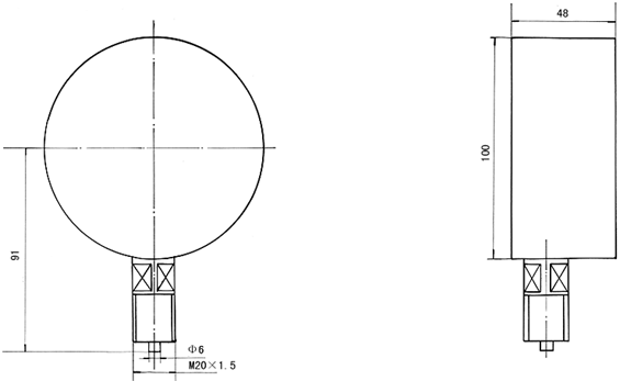■ 結構原理 膜盒壓力表由測量系統(包括接頭,波紋膜盒等),傳動機構(包括拔桿機構,齒輪傳動機構),指示部件(包括指針與度盤)和外殼(包括表殼、襯圈和表玻璃)所組成。 膜盒壓力表的工作原理是基于波紋膜盒在被測介質的壓力作用下,其自由端產生相應的彈性變形,再經拔桿一齒輪傳動機構的傳動并予放大,由固定于齒輪軸上的指針逐將被測值在度盤上指示出來。 YE-100膜盒壓力表外形尺寸